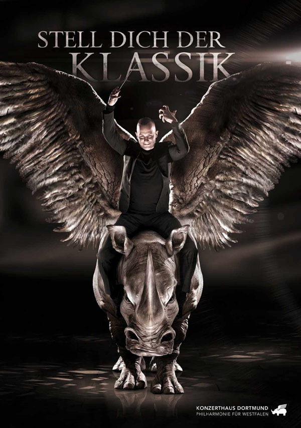 充满想象会飞的犀牛,德国音乐厅宣传海报设计可真够大胆的。画面表现了如此庞大的身形和巨大重量的犀牛,插上轻盈的翅膀在音乐中翩翩起舞,如蝴蝶般的轻歌曼舞......音乐厅的品牌形象设计海报很好地诠释了音乐能够带来什么?是一种超现实主意奇遇般的旅程,所有的正常事物都会超乎想象的出现在您的身边,如同梦境一般,音乐的梦境,VI形象设计的梦境做到了。